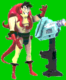 First up is the Creeper, also known as . . . can't say as I know off hand. The back story on this happy young PVC product is that he was attacked by the Joker, lived to laugh about it, and became some kinda mutant crime fighting dude. Good thing because Gotham definately has a shortage of those eh? Anyway, this pic was taken on the set of STAR WARS EPISODE ONE where smiley is working as a Camera gate checker. Just a little Green Screen humor for those of you into SFX.